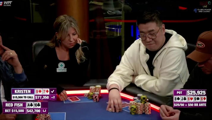 Kristen再次过牌,Red Fish直接超池下注$15,500。拿着最佳牌的Wolfgang弃牌了。但Kristen经过思考后决定跟注,成功抓诈赢下总计$41,425的底池。
