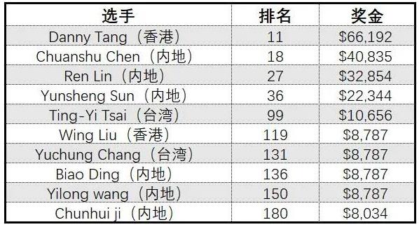 此外,还有10位中国内地及中国港台选手在本场比赛中打进了奖励圈: