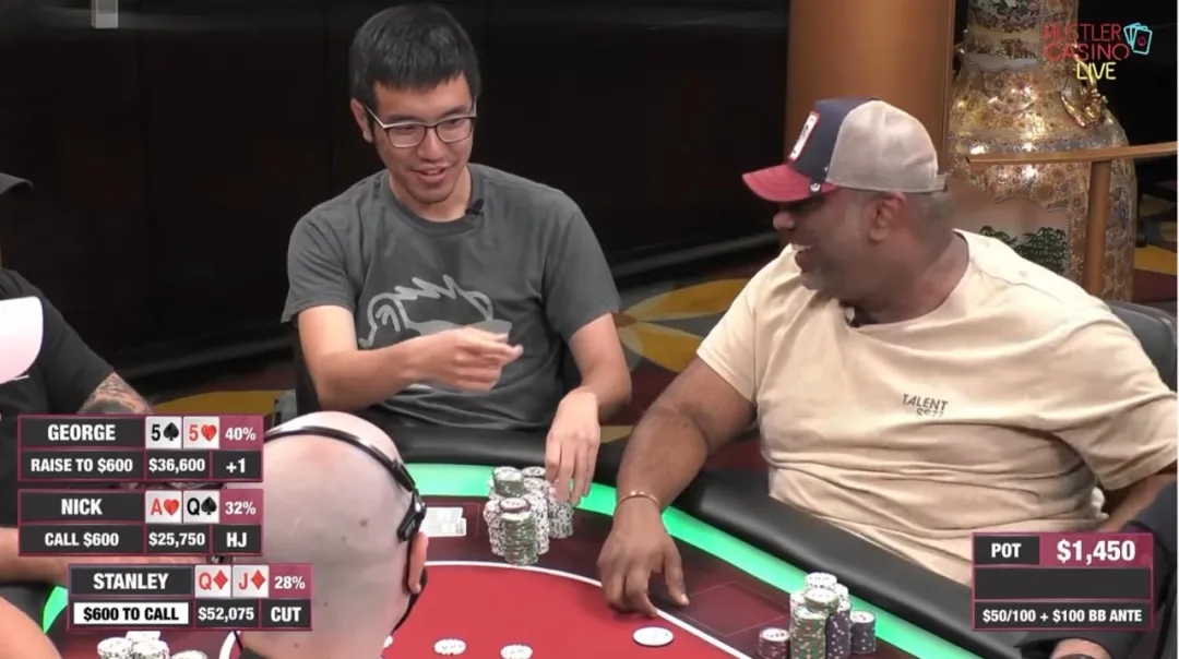 George在UTG+1位置用5♥5♠率先加注到600。Nick Vertucci在HJ位置用A♥Q♠跟注,然后Stanley Tang在CO位置用Q♦J♦跟注。其余人弃牌。