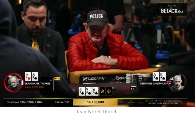 这手牌发生时,盲注级别已经来到了100,000/200,000,而Pardo只剩下19个大盲。翻前,Pardo拿着K♦K♣从UTG位置加注到400,000,非常标准的行动。HJ位的Jean Norel Thorel用A♥A♣ 3bet到1,000,000。筹码最多的Stephen Chidwick在小盲位手持A♠K♠ 4bet到2,300,000。大盲位的Daniel Cates坚定的弃掉了手中的J♣J♥。现在行动回到Pardo,他还剩下3,400,000筹码,但就当Pardo还在思考的时候,HJ位的Thorel却不按顺序口头宣布“all in”。Pardo犹豫了一下最终选择弃牌,Thorel正式全压,筹码约为760万。Chidwick跟注。