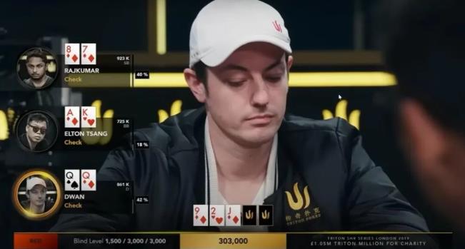 Dwan(42%)和Rajkumar(40%)在底池中的胜率几乎相同,而Tsang(18%)仍然有很多方法可以通过两张高牌和后门抽牌来赢得这手牌。