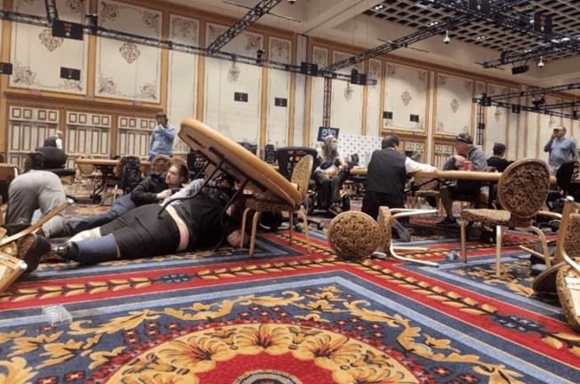 事件发生时,很多玩家都慌乱地向出口跑去或者躲到桌子底下,场上的筹码和桌子全部打翻在地,三场正在进行的WSOP比赛不得不终止。
