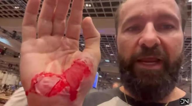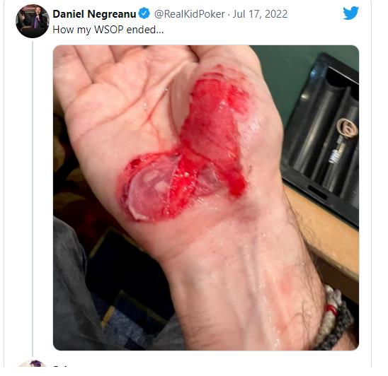 在因恐慌发生的踩踏事件中,几名玩家受了轻伤,其中包括6条金手链得主Daniel Negreanu(丹牛),他在倒地后右手撕裂。接受治疗之前,他在推特上发了一张受伤的图片。