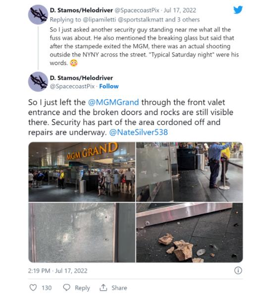 拉斯维加斯警方说,在米高梅大酒店的代客泊车区,一扇玻璃门被石块击碎,导致恐慌波及整个大道上的娱乐场,那里的扑克桌被掀翻,人们被践踏,试图逃离这一场虚惊。