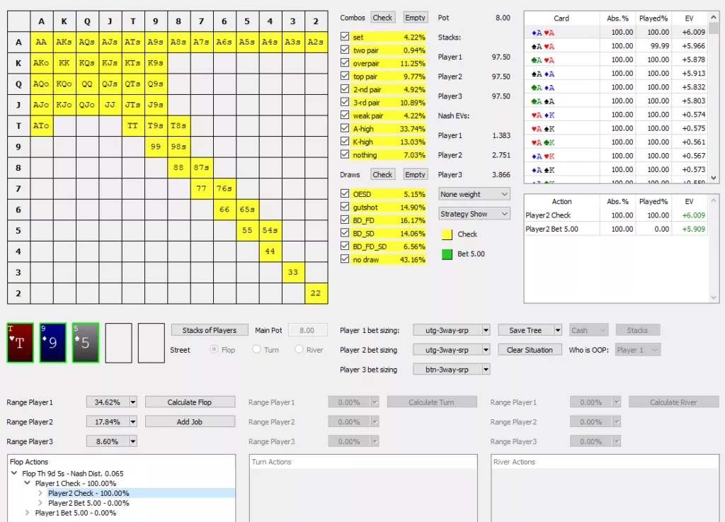 最后一个重要因素是:因为你在对抗两个牌手,你对抗一手强牌的概率显著增加。如果你综合考虑这些理由,下注还是过牌的决定变得比初看起来更接近。将这手牌的细节输入到最先进的三人底池分析Solver软件,我们可以看到Solver选择总是过牌(黄色代表过牌):