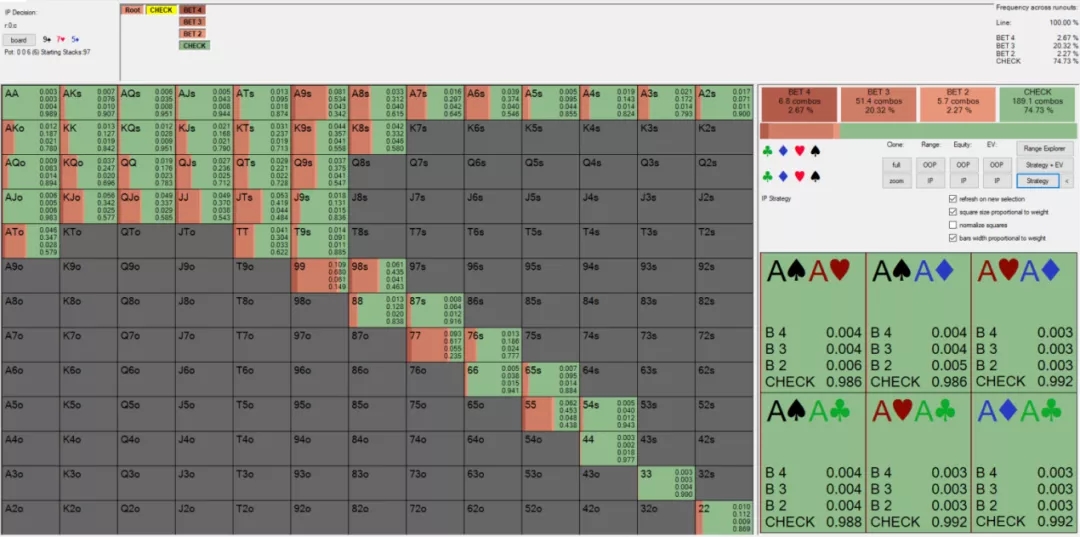 Solver也计算出过牌的期望值(EV)比下注60%底池大小多0.01BB(你可以在上图右中部看到两种选择的EV)。过牌之后的计划是什么?这个部分有点棘手,因为它取决于以下这些因素: