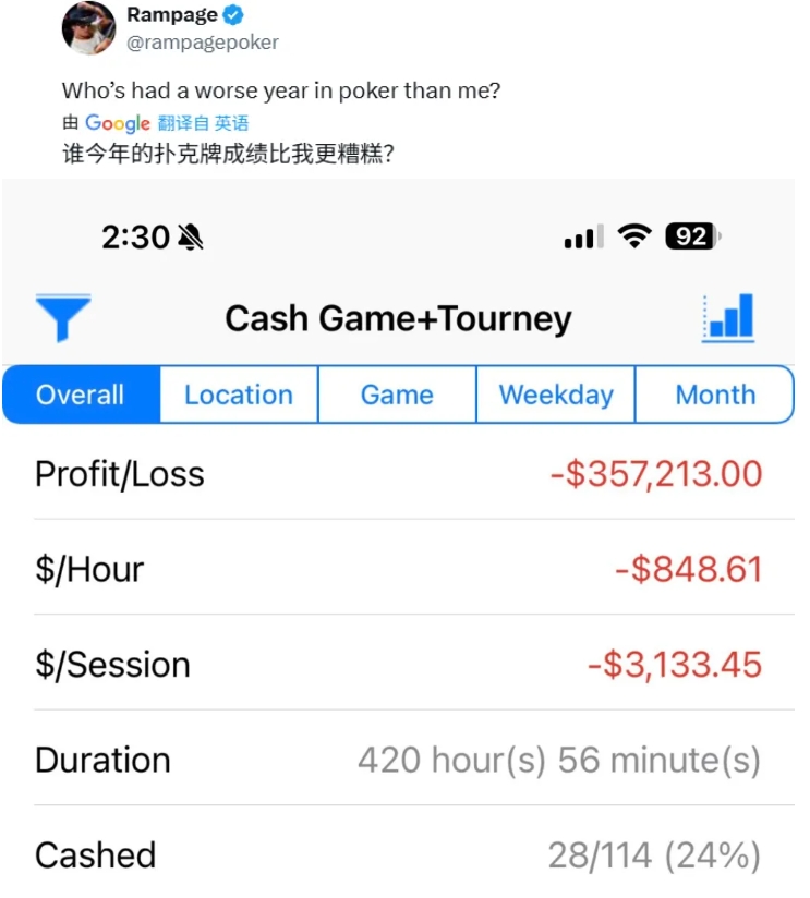 虽然在WSOP比赛中打得很艰难,但Rampage这357,213美元的亏损,大部分并非来自锦标赛,而是源于高额常规桌游戏。