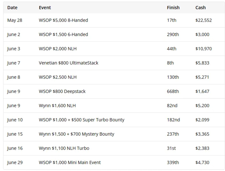 尽管夏季赛程紧凑,除了WSOP外,Rampage还参加了永利夏季经典赛和威尼斯人深筹码锦标赛,但他上半年收获的锦标赛奖金仅为182,925美元,这是他自2021年转而参加更多锦标赛以来的最低纪录。