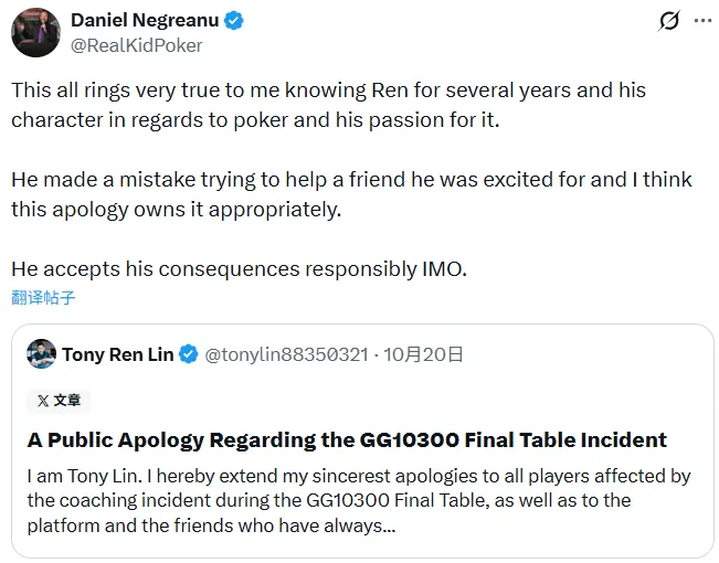 事发后,同为GG Poker大使的Daniel Negreanu在X(原推特)上发文,肯定了Lin负责任的态度。