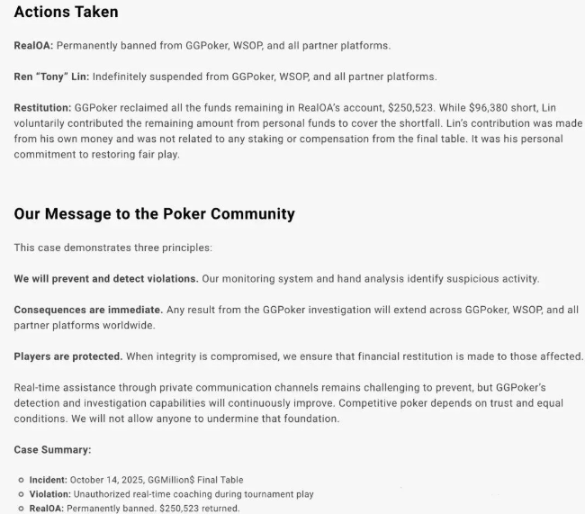 不到一周后,GGPoker发布正式声明:“RealOA”被永久封禁,而Ren Lin则被 “无限期停赛”,范围包括GGPoker、WSOP及所有合作平台。