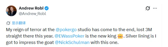 翻译:我在@pokergo的恐怖统治已经结束,今年在那里已经连续输了300万。@EWassPoker是新王。值得安慰的是,我用这个弃牌给@NickSchulman留下了深刻印象。