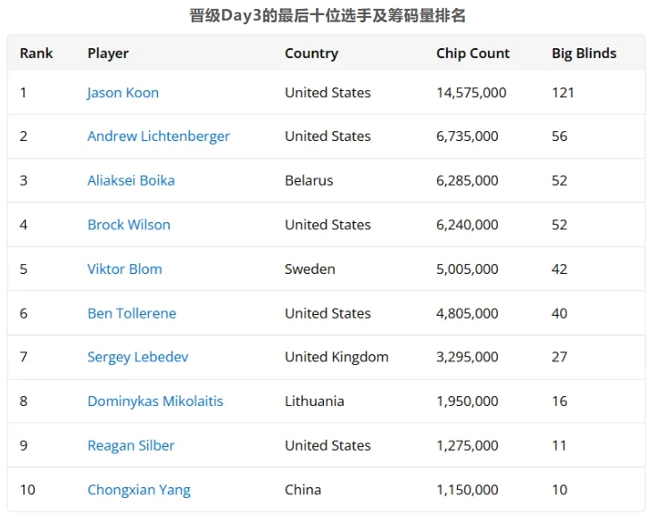 Day2结束时,比赛还剩最后10位选手,在这手史诗级对撞中胜出的Ben Tollerene位列6。而其中的领头羊是传奇高额桌杀手Jason Koon,他的筹码量几乎是其他选手平均筹码量的三倍。