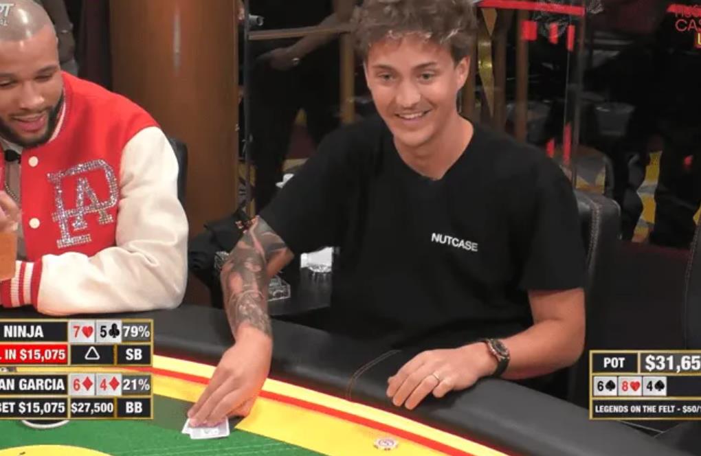 大约一分钟后,Ninja宣布“我跟注”,Garcia问道:“你有什么牌?”