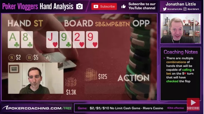 Vaughan可能会在这里思考是否要挤压,“我做了straddle,我需要战斗。”然而,这是一个很好的跟注机会。大多数玩家都会避免在straddle位玩得太松太凶。