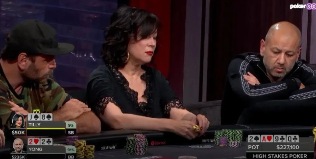 Tilly拿到了卡顺听牌,她过牌。Yong随后过牌,底池大小:$227,100。