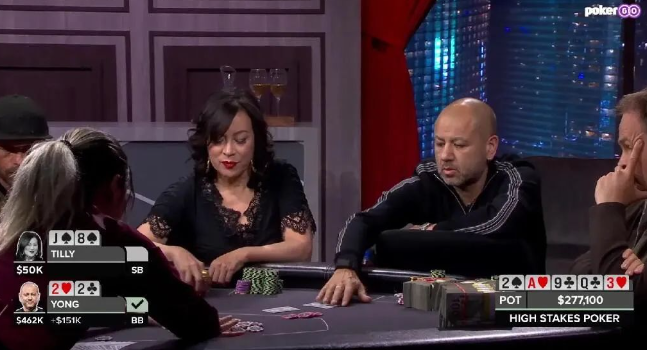 前面玩家过牌到Robl,他做了一个$15,000(12%底池)的小额持续下注。Salomon很快弃牌,但Tilly似乎意识到Robl在“偷池”,她过牌-加注到$45,000,后手仅剩下$50,000。不幸的是Yong拿着暗三条,他跟注。Robl弃牌。底池大小:$227,100。
