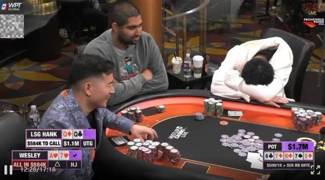 但问题是Wesley四个小时前刚刚输掉了扑克直播史上最大的彩池,他很可能已经上头了。这也许就是Hank跟注的原因。