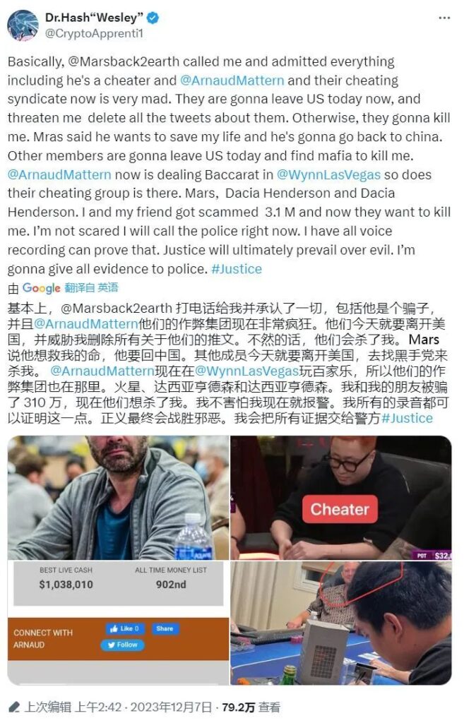 Hustler Casino Live的两位常客玩家Airball和Wesley,指控Arnaud Mattern是一个作弊团伙的头目,该团伙利用有标记的扑克牌,在加利福尼亚州约巴林达的私人游戏中赢取了310万美元。(戳右边链接回顾详情:Wesley、Airball指控“密友”在私人扑克游戏中作弊,骗走数百万美元)