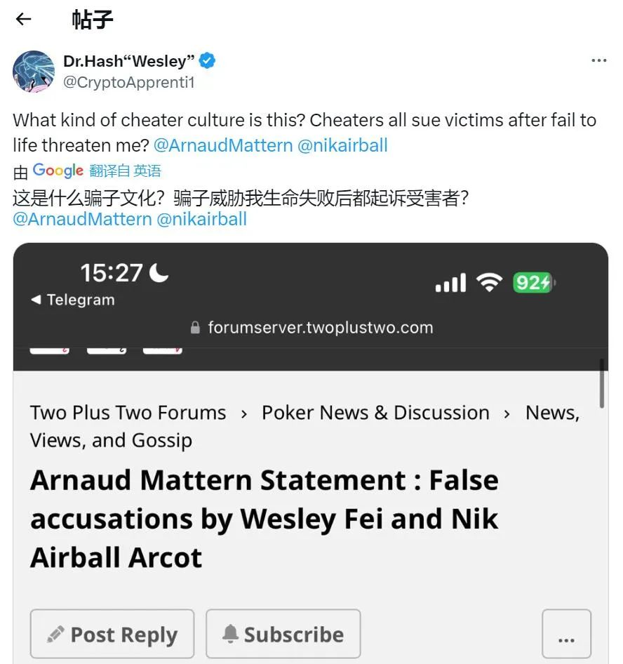 德州扑克游戏新闻:Wesley和Airball因“药水牌”作弊指控,被法国职业牌手起诉诽谤