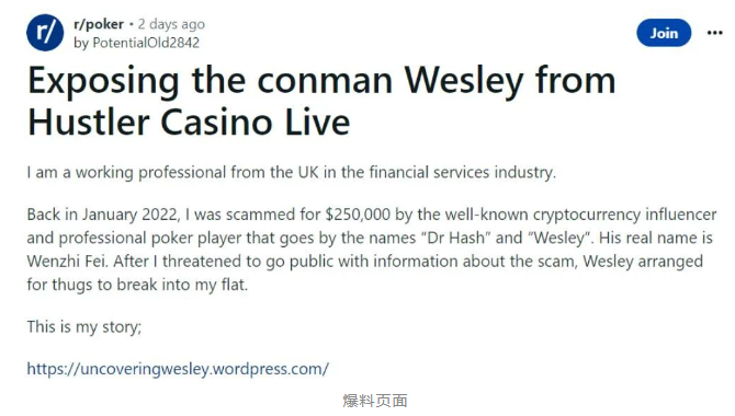 人称“币圈永赚教授”的Hustler Casino Live常客玩家Wesley,日前在社交新闻网站Reddit上被指控诈骗。