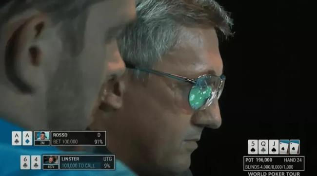 Mike Linster(489,000筹码)在CO位拿着6♣4♣加注到17,000,按钮位的Christopher Rosso(2,189,000筹码)A♣A♦用3bet到40,000,Linster跟注。底池:96,000。Linster应该弃掉这手6♣4♣,即使是在这样的四人决赛桌。他的左边是筹码领先者,而小盲位的筹码量很少,所以他应该收紧翻前的范围。