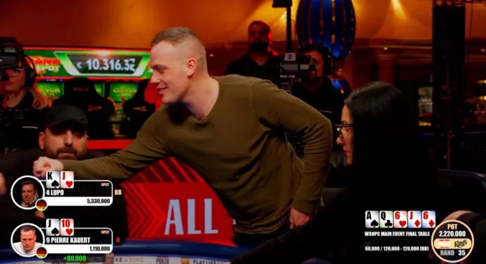 翻前,拿着J♠T♥(T代表10)的德国牌手Pierre Kauert,用剩下的100万筹码全压,对手Lupo用K♠J♥跟注,底池约220万。