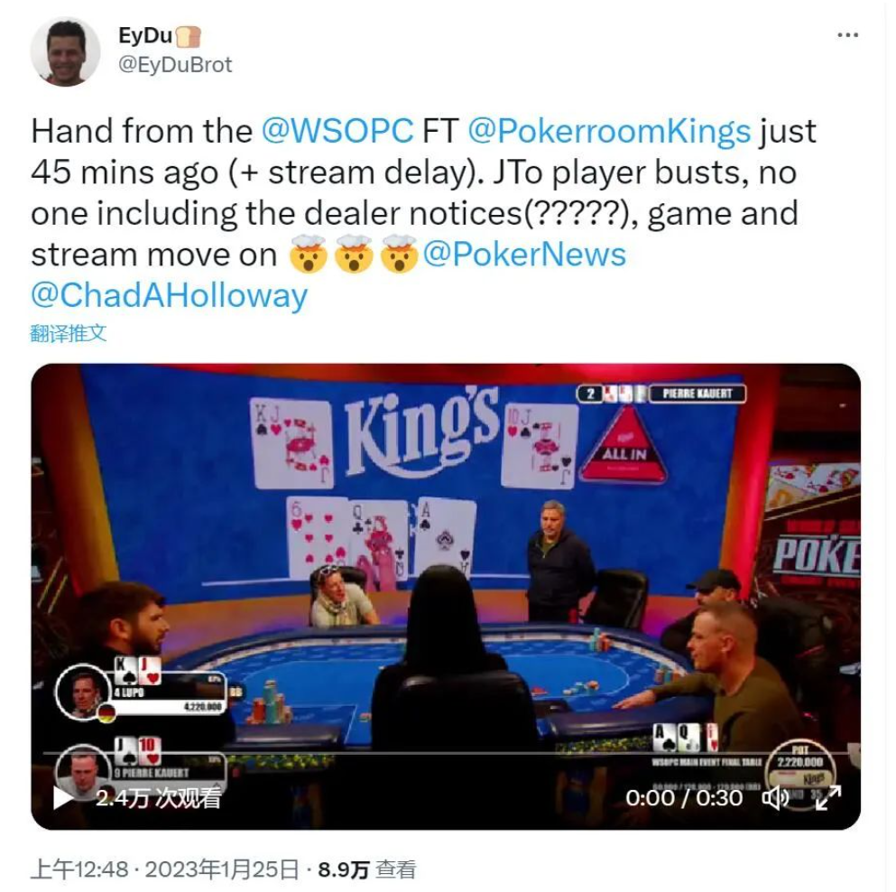 据现场消息人士透露,玩家只能在另一手牌发牌前对一手牌提出异议。在这种情况下,游戏只能继续进行,国王娱乐场也是简单粗暴删除视频后,继续了后面部分的直播。