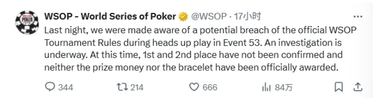 WSOP在当地时间周四上午通过其X(原推特)官方账号发布声明称: