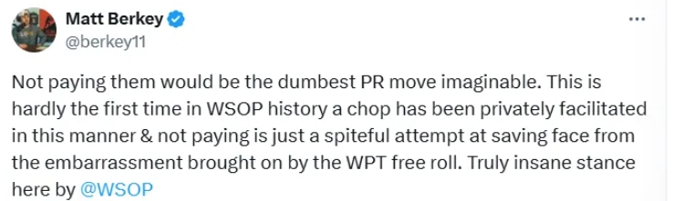 针对WSOP的调查行为,多位扑克界知名人士在社交媒体上发表了看法,其中大分人认为应支付奖金: