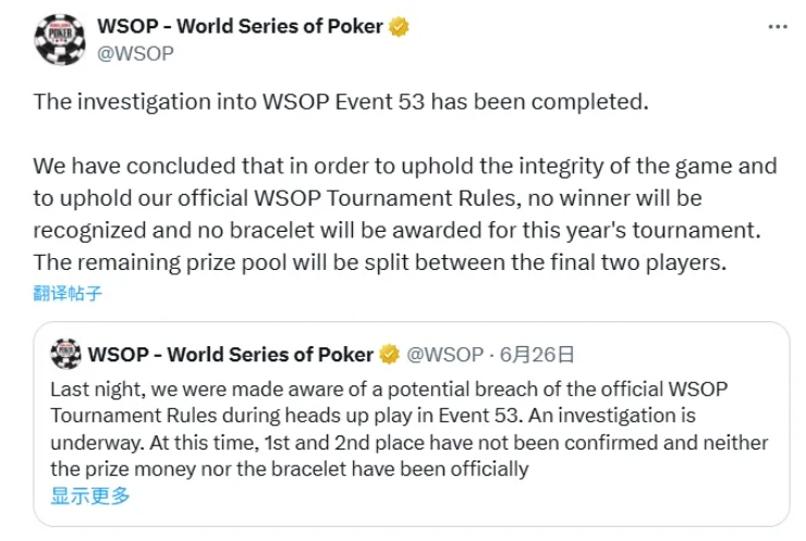 “我们对第53号赛事的调查已完成。为维护比赛的公平性与WSOP官方规则,我们决定不承认任何人为该赛事冠军,也不会颁发金手链。剩余的奖金池将由最后的两位选手平分。”