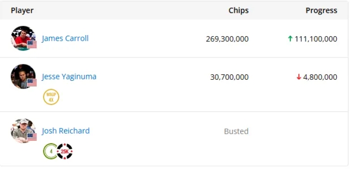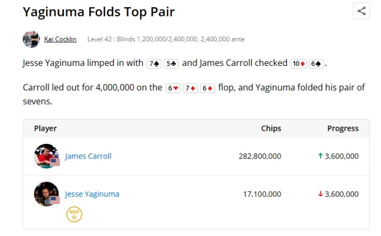 然而这之后,Yginuma通过不断地加注与全压反击,多次成功让Carroll弃牌,在几乎未进入摊牌的情况下,竟一步步扳回局势。