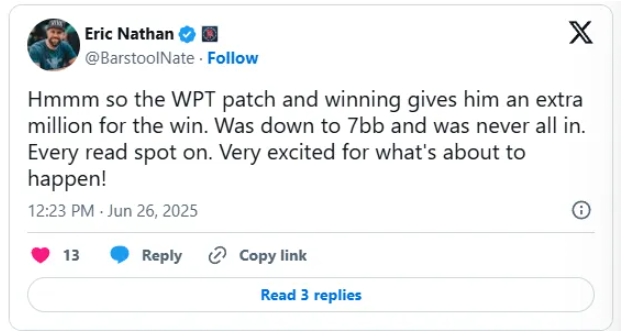知名博主兼扑克玩家 Eric “Barstool Nate” Nathan在X上写道: