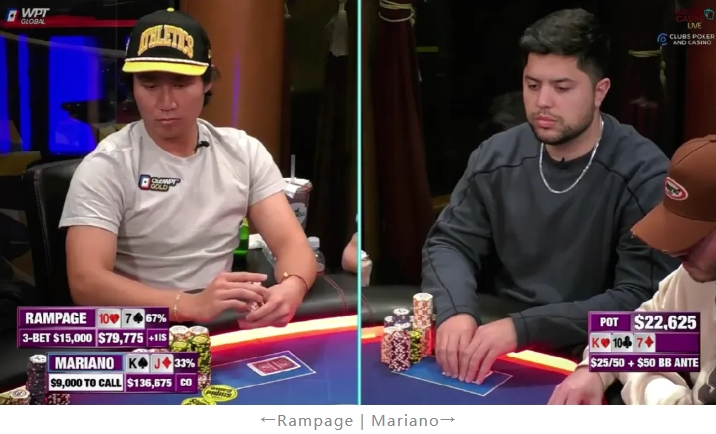 Rampage和Mariano打出了当晚最大的彩池,对于过去一年一直关注这两位玩家的人来说,谁能赢得这手牌都不奇怪。