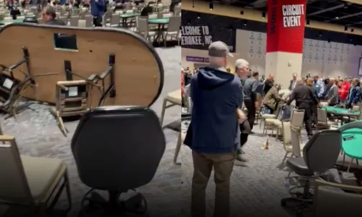 周日,在哈拉斯切罗基举行的世界扑克巡回赛 (WSOPC) 主赛上,一位不明身份的男子在暴怒之下掀翻了三张扑克桌,现场一片混乱。