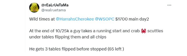 周日,在哈拉斯切罗基举行的世界扑克巡回赛 (WSOPC) 主赛上,一位不明身份的男子在暴怒之下掀翻了三张扑克桌,现场一片混乱。