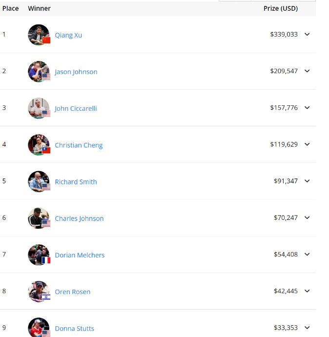 本场比赛夺冠前,徐强在本届WSOP的其他赛事中也取得了很不错的成绩:赛事#19:第9名,奖金34,210美元,赛事#34:奖励圈第58名,奖金11,876美元,赛事#3:奖励圈第1188名,奖金1,853美元。