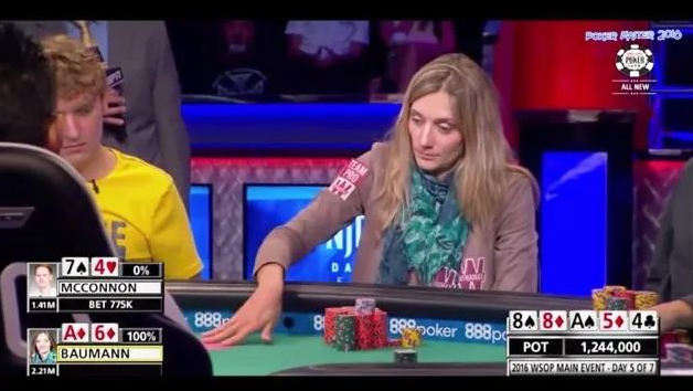 在翻牌A♠8♠8♦,Baumann发现自己中套路了。她的牌要么远远领先对子或高牌,要么远远落后更好的A或一张8。
