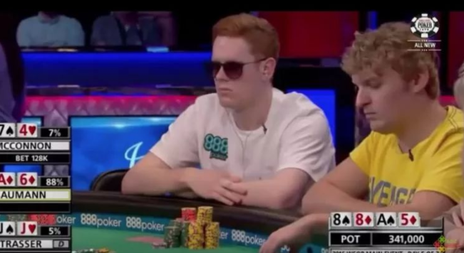 McConnon一开始只需要投入31,000,然后通过机智的打法,在对手拿着更好牌的情况下,得以增加了300,000筹码。我们来仔细研究一下他是如何做到的。翻牌前,Baumann在前面位置做了一个相当松的加注。