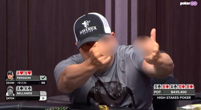 在最新一集的High Stakes Poker(高额桌扑克)节目中,Eric Persson对Jean-Robert Bellande打出一记非常漂亮的诈唬,并在亮牌后双手竖起中指,颇为挑衅地向对手展示自己偷鸡成功,夺走$435,400大池的得意之情。