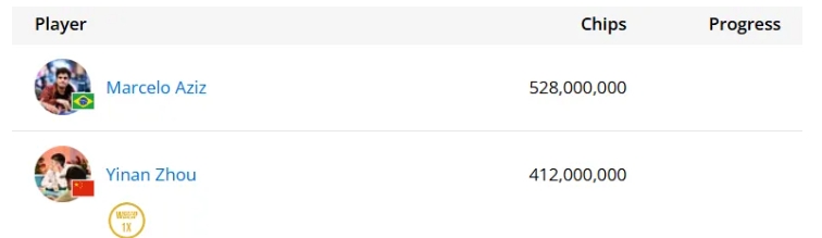 在和巴西选手Marcelo Aziz进入最后的单挑时,周懿楠的筹码量略低于对手。