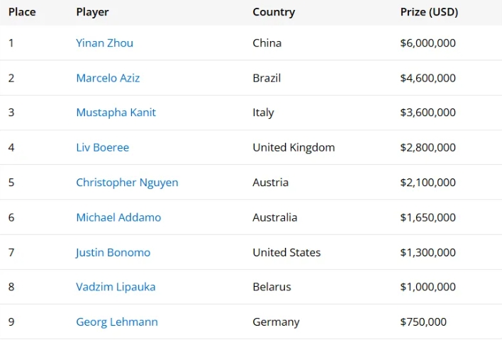 进入决赛桌的9人中,有好几位非常知名的选手,像是澳大利亚豪客桌大神Michael Addamo、历史上唯一一位同时赢得WSOP金手链和EPT赛事冠军的女选手Liv Boeree、以及位列扑克历史奖金榜第二的美国选手Justin Bonomo。在赛前他们都被普遍认为是冠军的有力争夺者。