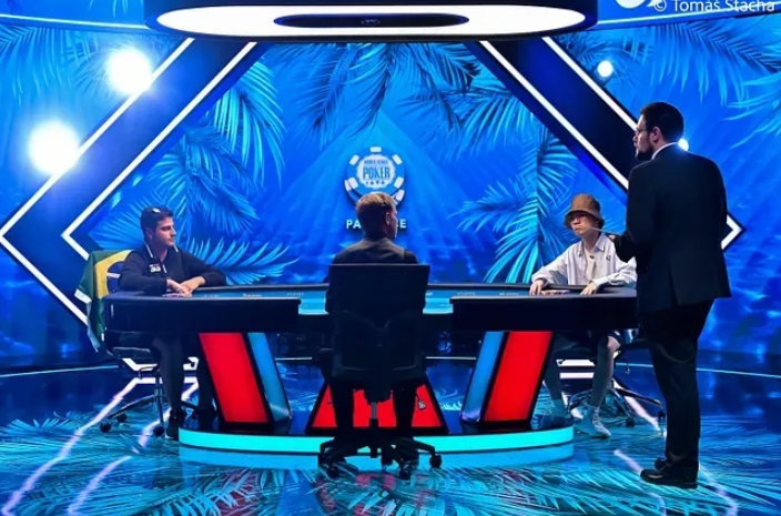 在和巴西选手Marcelo Aziz进入最后的单挑时,周懿楠的筹码量略低于对手。