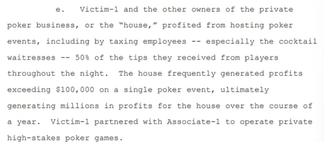 受害者1雇佣了一整套人员,为扑克牌游戏营造“派对般的氛围”,包括:侍酒女招待、厨师、调酒师、发牌员,同时还雇佣了私人保安“为扑克牌游戏提供安保服务”,旨在让“精英客户”在住宅内进行高额扑克游戏时感到安全和安心。