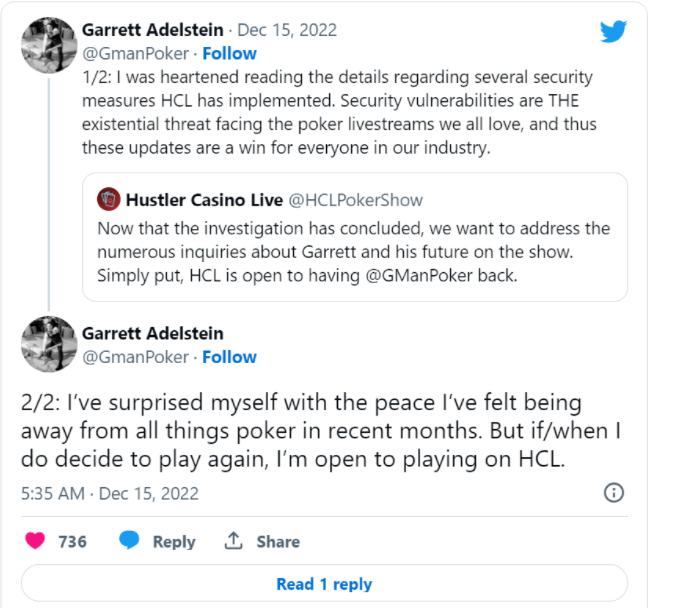 “在过去远离扑克的一个月里,我在互联网上看到人性的黑暗面,但同时也觉得生活焕然一新。如果当我决定再参加比赛时,我愿意回到HCL。”