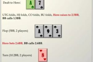 1、牌局过程 翻牌前:前面位置玩家弃牌,Hero在小盲位置用A♣7♠加注2.5BB,大盲位置跟注。 翻牌:A♠9♠3♠,Hero下注2.6BB,大盲跟注。转牌:8♥,Hero下注7…