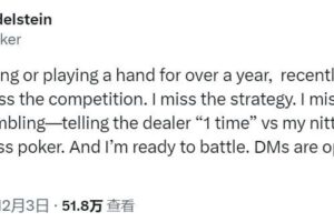 自本月初在推特上发布了“回归宣言”后,周三晚间,因“J4o手牌争议”远离扑克圈近15个月的Garrett Adelstein(盖哥),终于重回扑克赛场,但并不是Hustler Ca…