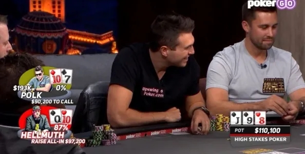 在他第一次参加这个著名的电视节目,对阵Phil Hellmuth的牌局中,Polk在J♠9♠8♦的翻牌上弃掉了T♦7♣(T代表10)!