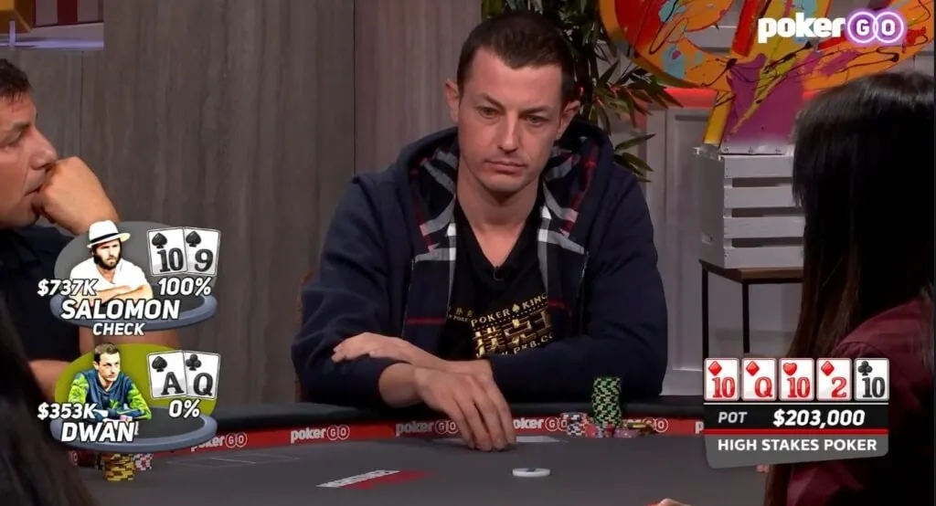 Salomon率先过牌,然后Tom Dwan做了一个相当小的下注21000,JRB跟注,Salomon突然加注至到63000。Dwan跟注,JRB弃牌,彩池大小:203,000。