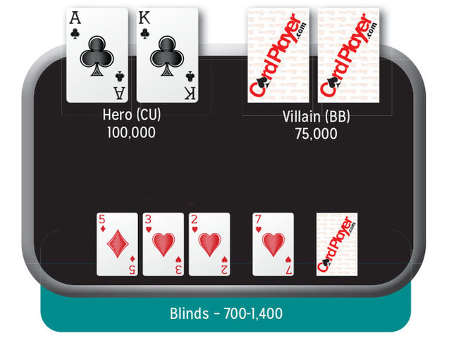 你在打一个$5000买入的线上扑克锦标赛。你是桌上筹码最多的人(8人桌),约有100000筹码。盲注是700/1400。筹码第二多的选手约有75000筹码。前面玩家都弃牌,轮到你在CO位置行动,底牌是A♣K♣。