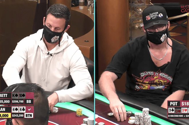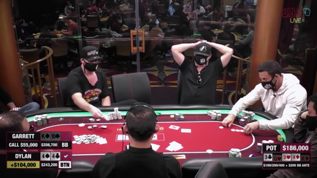 同样是在Hustler娱乐场的直播比赛,Dylan Gang上周用三条J赢下了盖哥的顶对KK,拿下20K底池一举反超成为场上筹码最多的玩家。此时的盖哥其实还剩下大约30K筹码,但他随后还是重新买入了180K让自己的筹码保持全场最高。